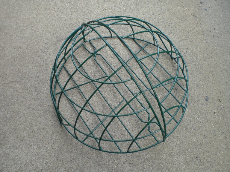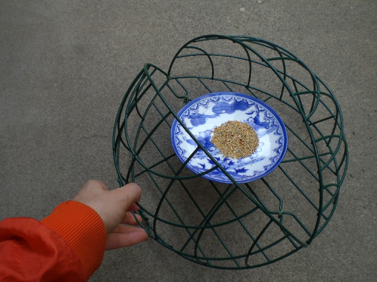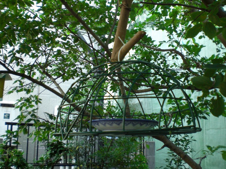 ハンギングバスケットを2つ組み合わせて、開いたり閉じたりできるようにしてあり、餌を入れたお皿を出し入れできるようになっています。